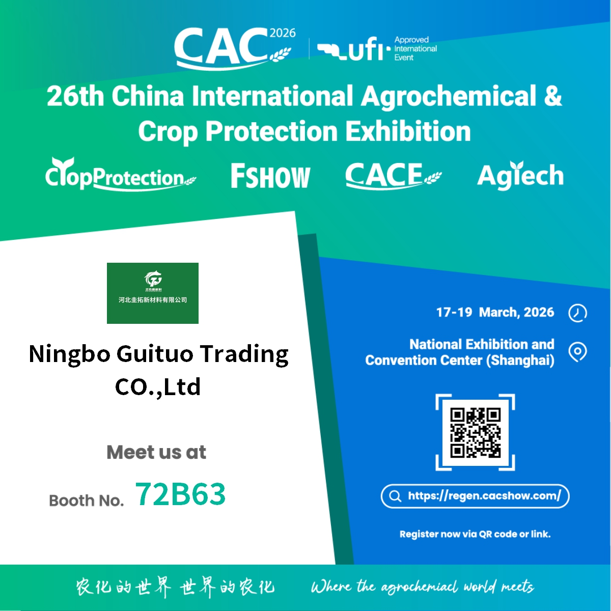 Ningbo Guituo Trading Co., Ltd. este mândru să-și anunțe participarea la A 26-a expoziție internațională agrochimică și protecția culturilor din China (CAC 2026) . Acest prestigios eveniment global va avea loc din 17 - 19 martie 2026 , la Centrul Național de Expoziții și Convenții din Shanghai.